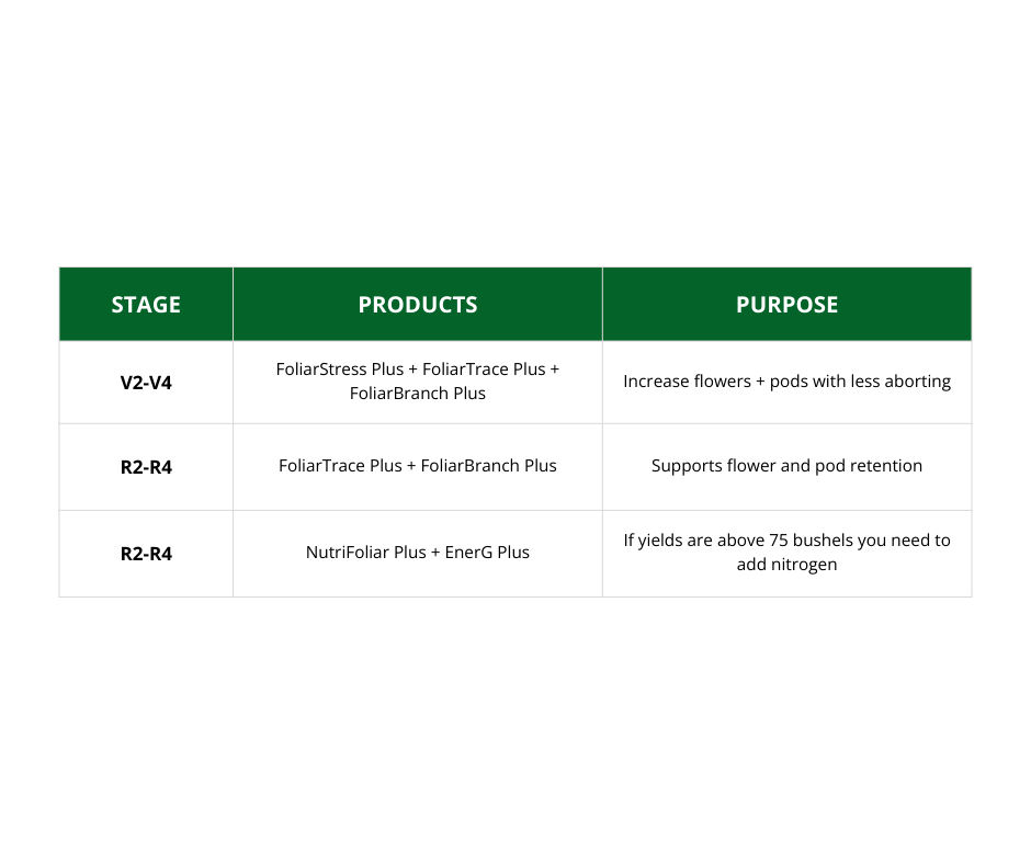 At R2-R4, reassess the FoliarStress Plus and FoliarTrace Plus to help hold flowers and pods to add yield. May add NutriFoliar Plus and EnerG Plus if yields are above 75 bushels
